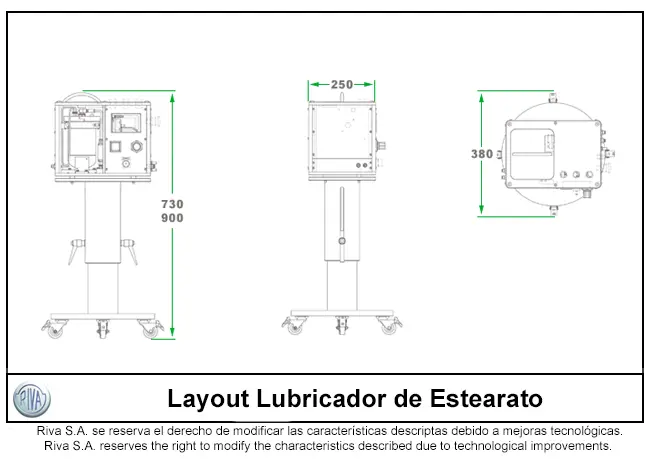 El sistema se compone principalmente de un recipiente contenedor, la placa de distribución y los accesorios neumáticos. La función del recipiente contenedor es incluir el estearato de magnesio, que más adelante se distribuye a través de las mangueras al deflector de salida. Se aplica el estearato en la punta del punzón inferior y dentro del agujero interior de la matriz, al mismo tiempo que se lubrica la punta del punzón superior. De funcionamiento muy simple, este equipo posee una pantalla touchscreen para operar y monitorear los distintos estados de funcionamiento y analizar alarmas con sus posibles soluciones.